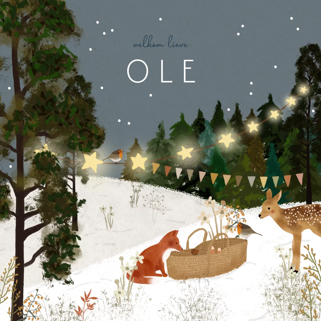 Wanneer je op zoek bent naar een uniek en stijlvol geboortekaartje, dan is dit vierkante goudfolie geboortekaartje met winterlandschap echt iets voor jou! Dit kaartje heeft alles: een prachtig winterlandschap met winter bosdieren, bomen, besneeuwde heuvels, een sterrenslinger en een vrolijke vlaggetjes slinger.In het midden staat een schattige baby in een reismandje. De naam en kleine stipjes als sterren in de lucht zijn gedrukt in goudfolie, wat het kaartje een chique en luxe uitstraling geeft.