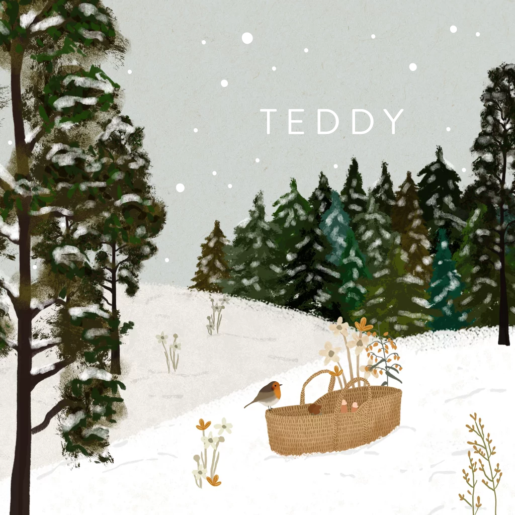 Vierkant gevouwen geboortekaartje met goudfolie besneeuwde heuvels en bomen, een roodborstje en een baby'tje in een reismandje.