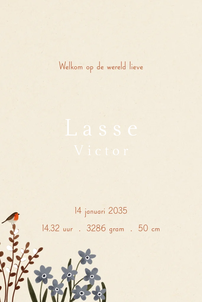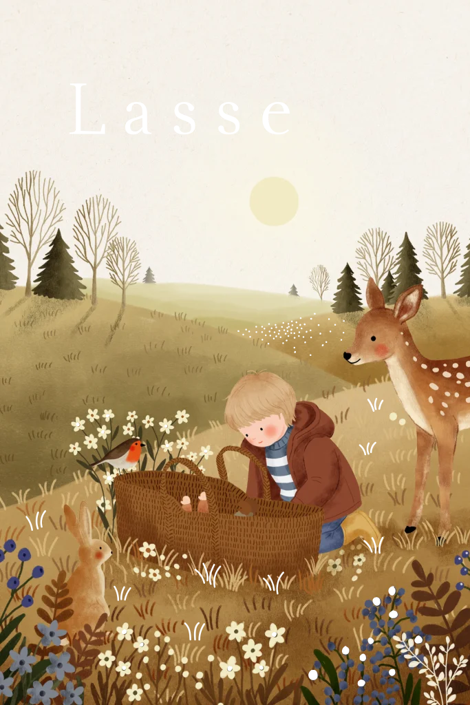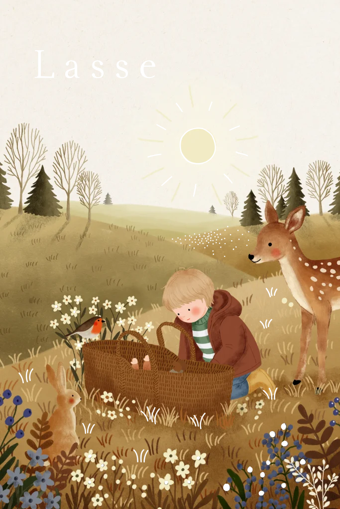 In verwachting van je tweede kindje, en uitgerekend in de winter? Dit is het perfecte geboortekaartje voor jouw kleine meisje of jongen als je opzoek bent naar een winters geboortekaartje zonder sneeuw. Het is een dubbel geboortekaartje en het kaartje is genderneutraal met blauwe kleuraccenten. Op de voorkant zie je een schattig reiswiegje, een grote broer, een heuvellandschap, een hertje, haasje en roodborstje. De naam van je kindje, en een aantal details van verschillende illustraties staan in goudfolie wat het een luxe uitstraling geeft.