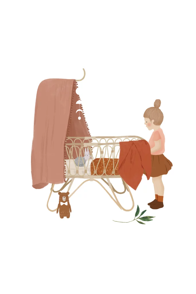 Geboortekaartje met wiegje, grote zus en goudfolie.