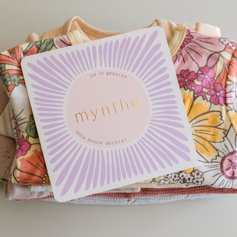 Enkel vierkant geboortekaartje met een grote bloem en goudfolie.