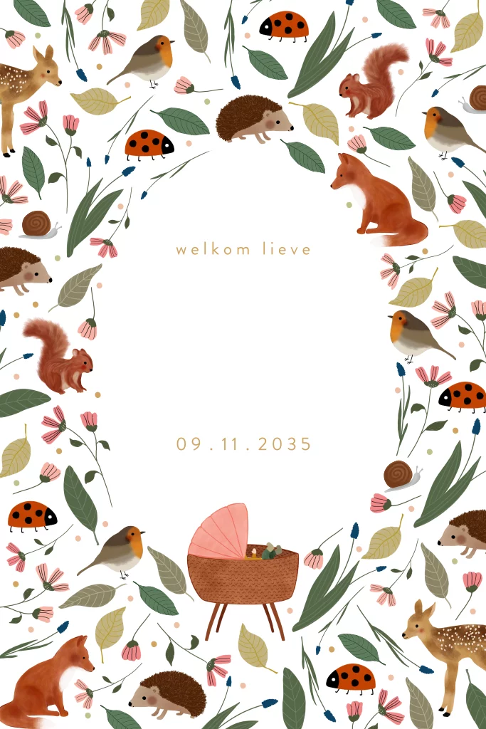 Geboortekaartje met bosdieren -slakjes, roodborstjes, eekhoorntjes, lieveheersbeestjes, vosjes, hertjes - blaadjes, bloemen, roséfolie, een baby'tje in een wiegje en ronde hoeken. Het kaartje is uniek en stijlvol door de toevoeging van roségouden folie. De bloemen, bosdieren en het wiegje zijn gedetailleerd afgebeeld en geven het kaartje een romantische en kleurrijke uitstraling.