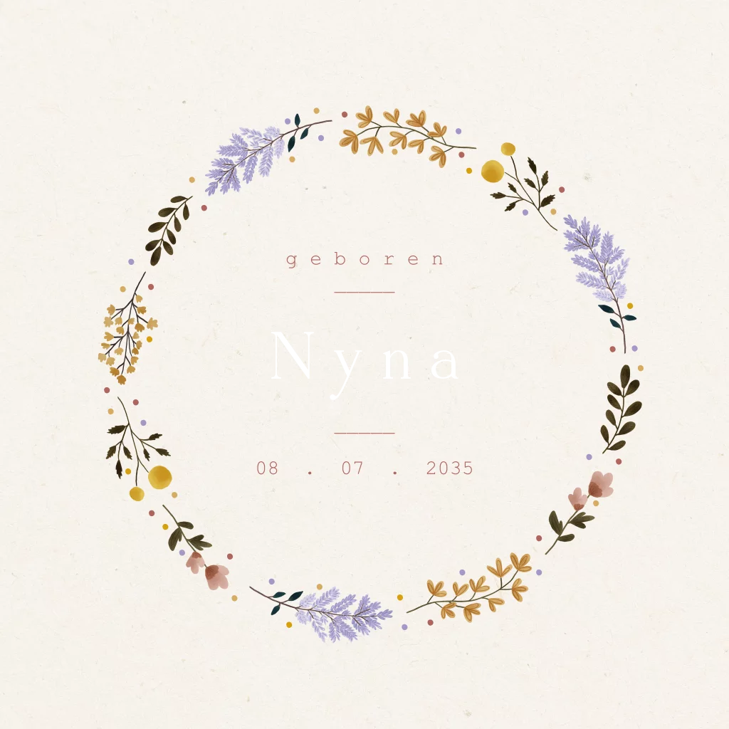 Foliekaartje met goudfolie, een bloemenkrans en ronde hoeken.
