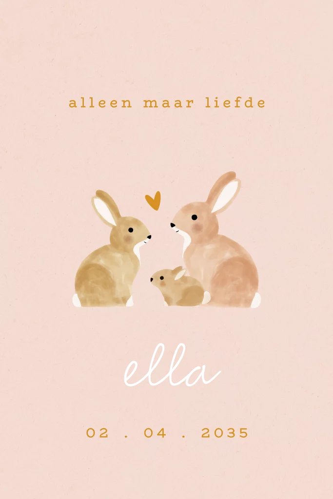 Lief geboortekaartje met een konijnen familie, een oudroze achtergrond, ronde hoeken en goudfolie.