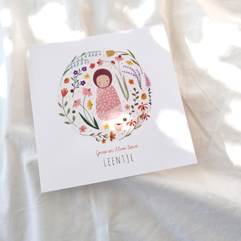 Foliekaartje met een ingebakerde baby bloemen en goudfolie