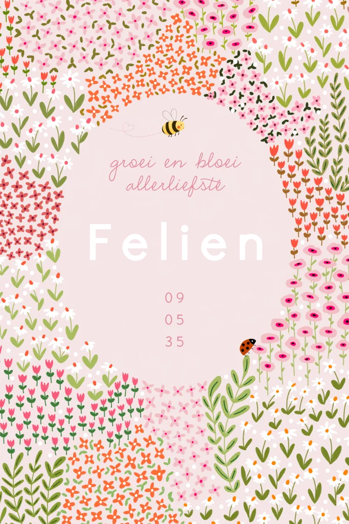 Geboortekaartje met bloemen, een bijtje en lieveheersbeestje
