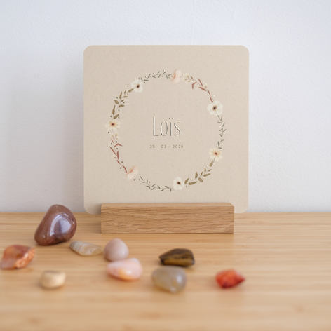 Dit vierkante geboortekaartje is een echte eyecatcher door de bloemenkrans, de gekleurde achtergrond en de goudfolie.