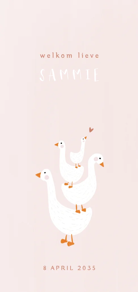 Geboortekaartje met goudfolie en familie gans tegen een zachtroze achtergrond.