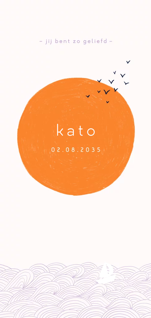 Geboortekaartje met een zon, golven, vogels en een bootje