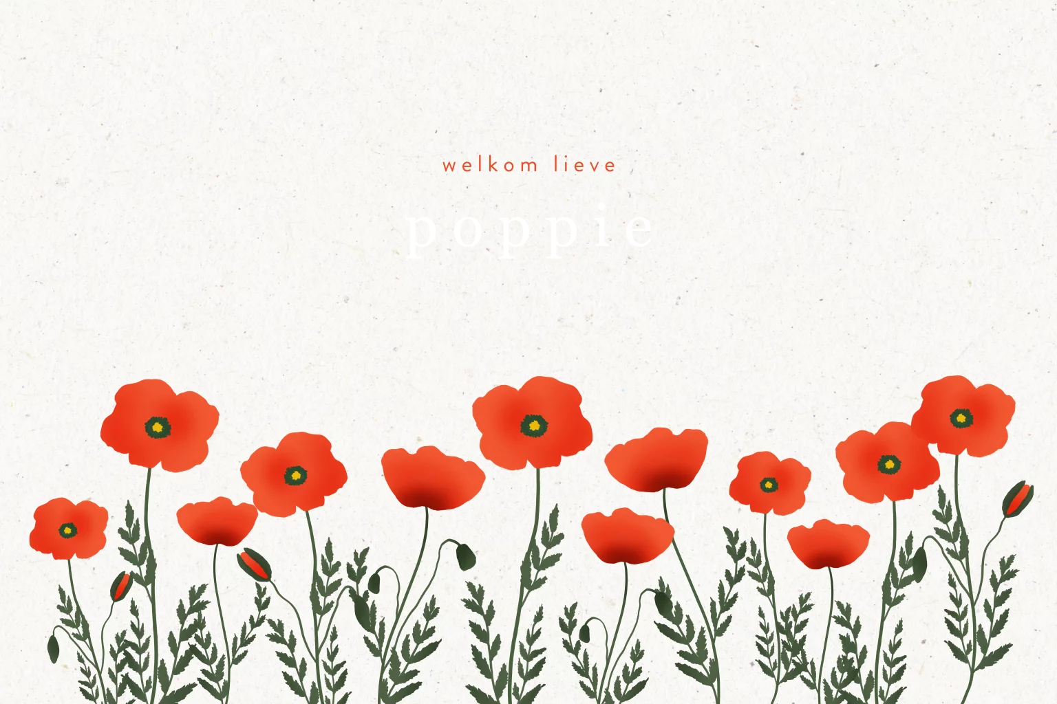 Geboortekaartje met klaprozen, goudfolie en ronde hoeken.