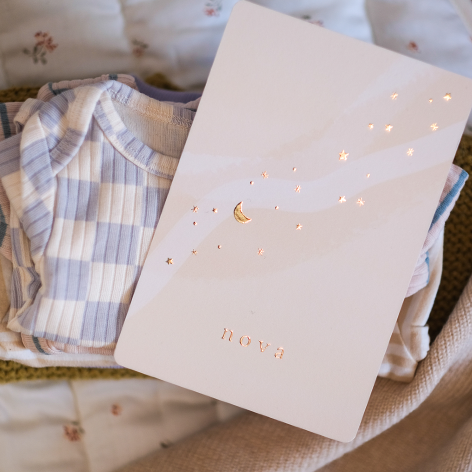 Geboortekaartje met zachte kleuren, het heelal - sterren en de maan - de melkweg.