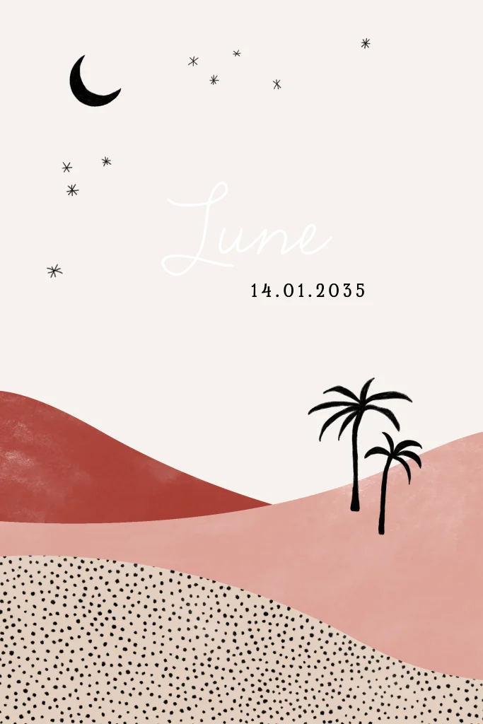 Dubbel staand geboortekaartje met palmbomen, woestijn, de maan en sterren en roséfolie.