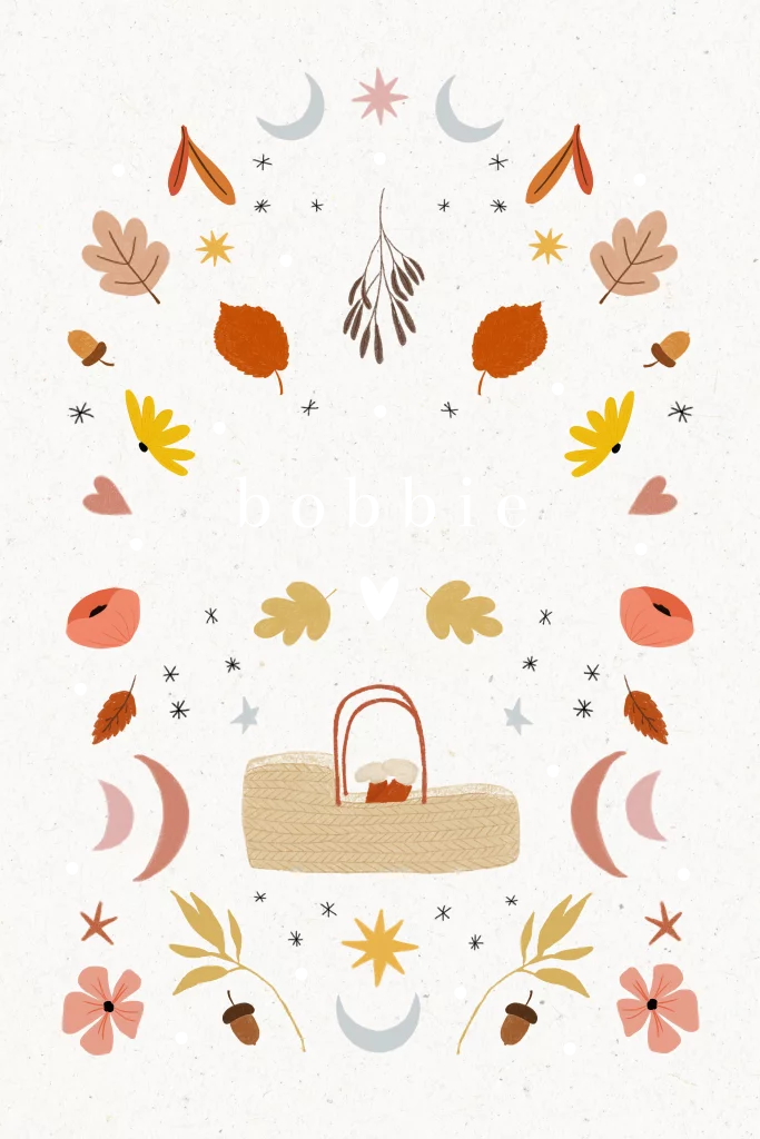 Herfst boho geboortekaartje met maantjes, sterren, takjes, blaadjes, een mozesmandje en goudfolie.