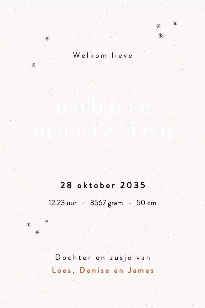 Kom je er niet helemaal uit, of vind je het fijn dat we met jullie meedenken over de opmaak van het geboortekaartje, stuur ons dan gerust een mailtje.