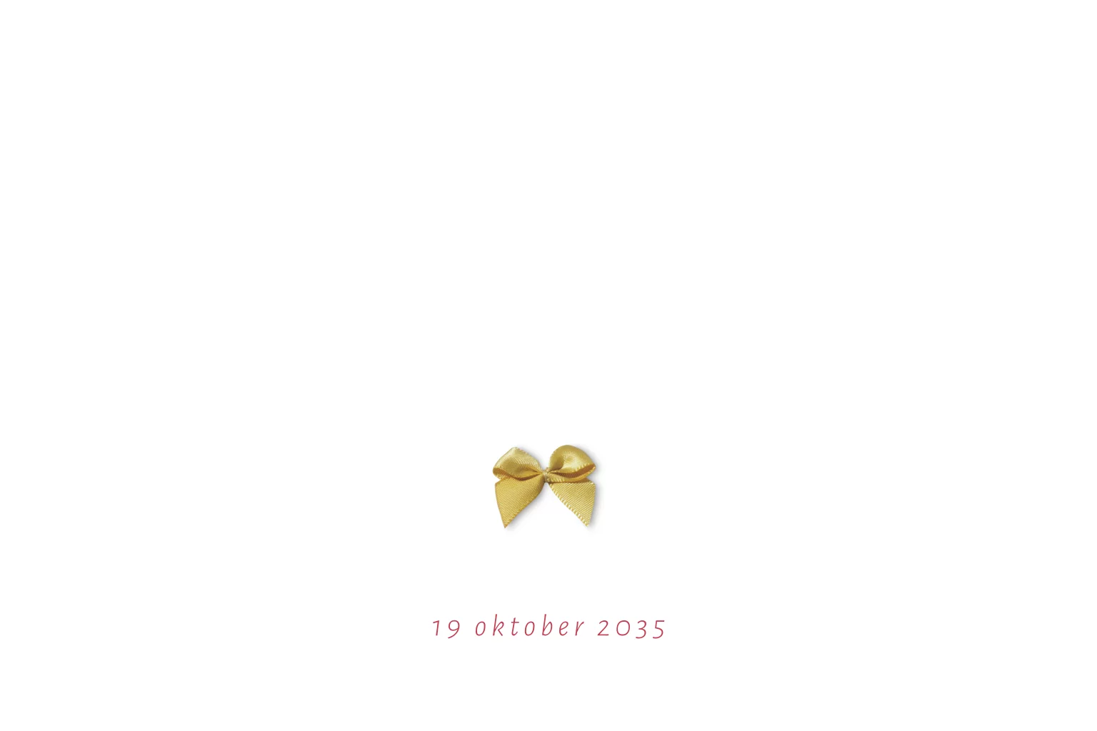 Klassiek liggend gevouwen geboortekaartje met een gouden satijnen strikje en roséfolie voor een meisje.