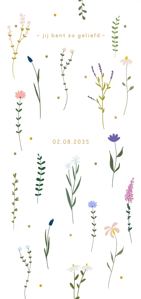 Langwerpig geboortekaartje met goudfolie, bloemen en ronde hoeken.