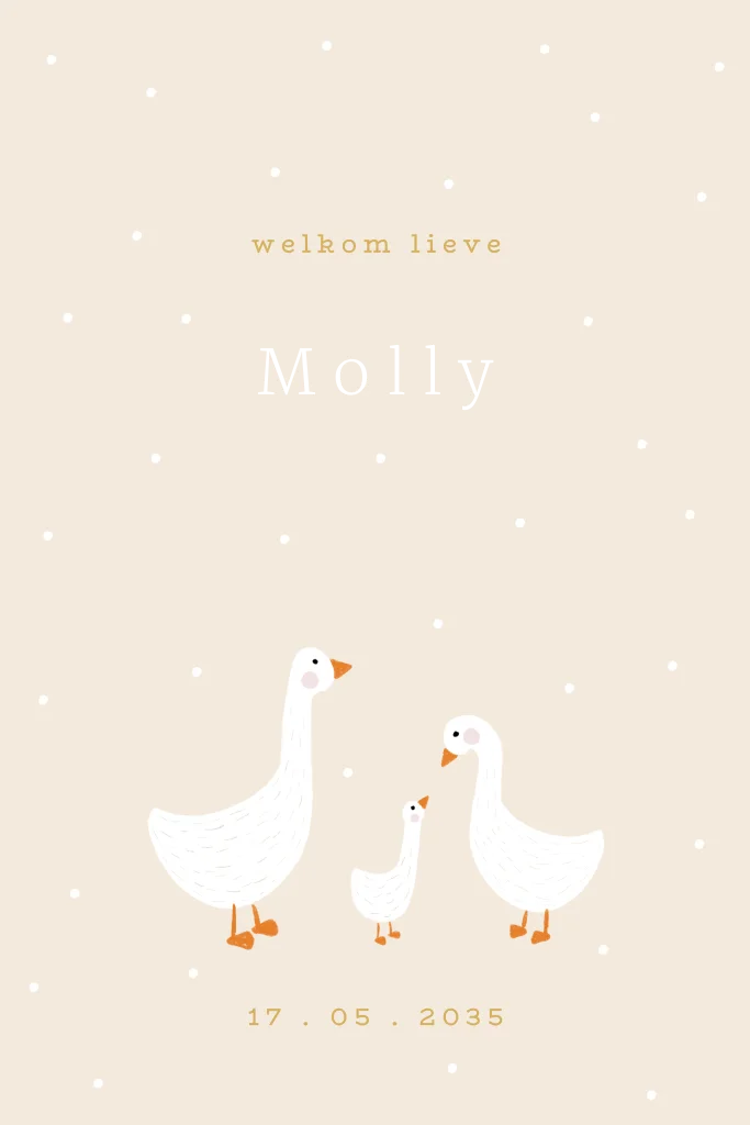 Lief geboortekaartje met goudfolie en een ganzen familie.