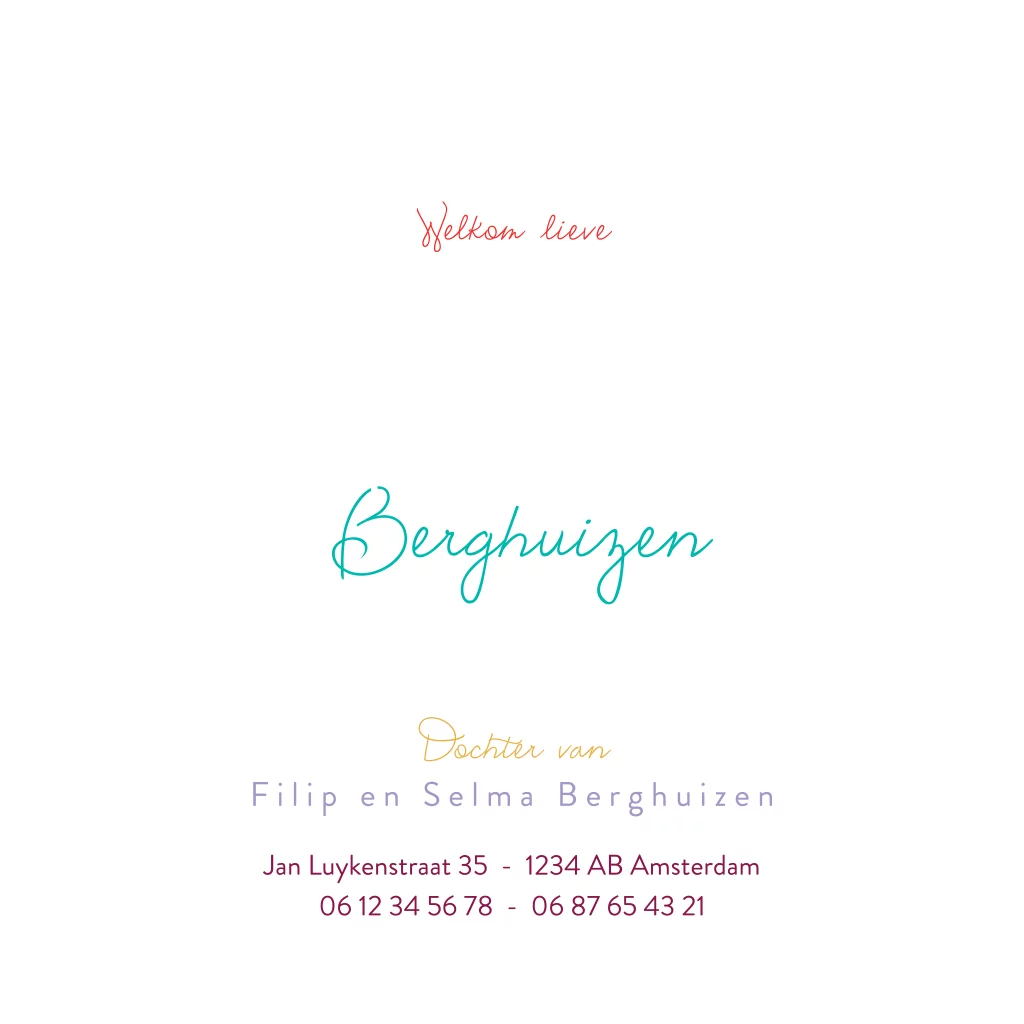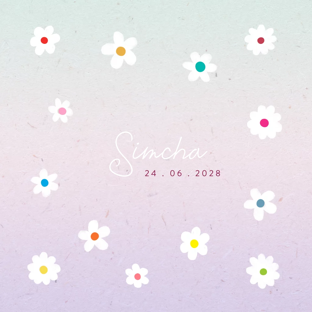 Lief kleurrijk geboortekaartje met witte bloemetjes en een paars - roze - groene gradient achtergrond.