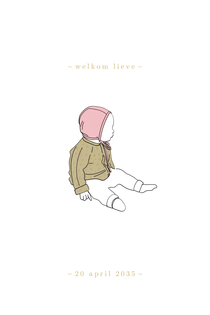 Lijntekening geboortekaartje met een meisje en goudfolie
