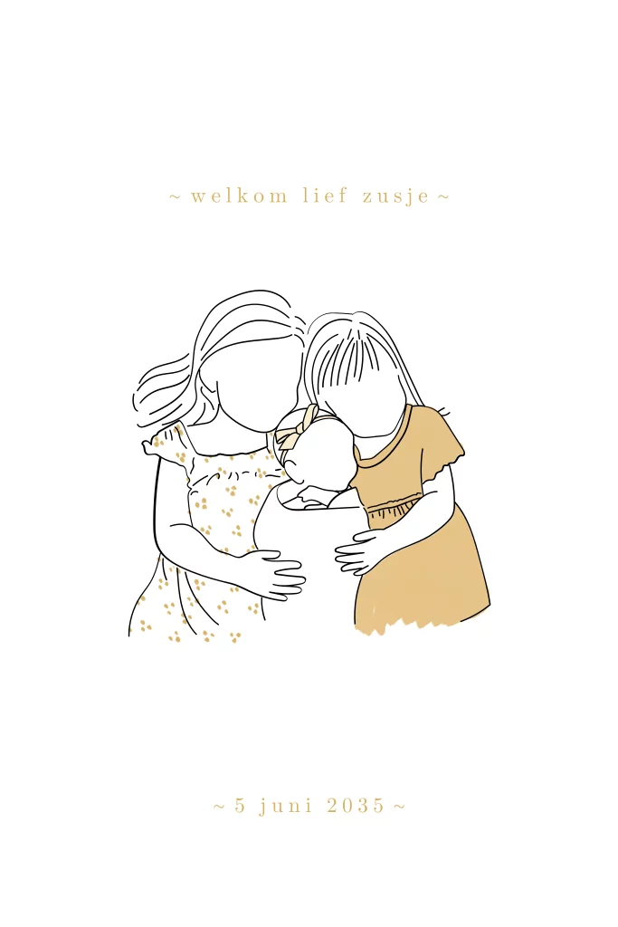 Lijntekening geboortekaartje met zusjes en goudfolie