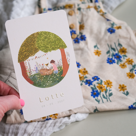 Enkel staand genderneutraal geboortekaartje met een kindje in een reiswiegje, een grote zus die bij het reiswiegje zit, vlinders, bomen, gras, bloemen en de naam in goudfolie.