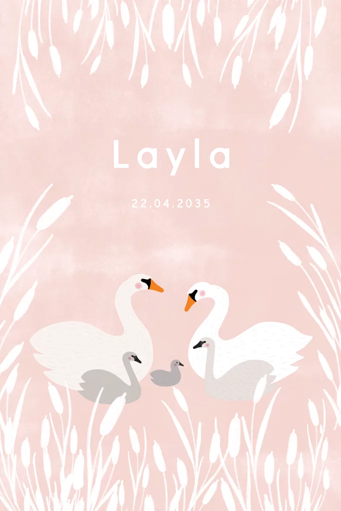 Dit unieke geboortekaartje is perfect voor natuurliefhebbers of dierenliefhebbers. Het kaartje heeft een roze achtergrond, witte rietpluimen en een familie zwaan. De voor- en achterkant van het kaartje zijn bedekt met goudfolie, wat het kaartje een luxe uitstraling geeft.