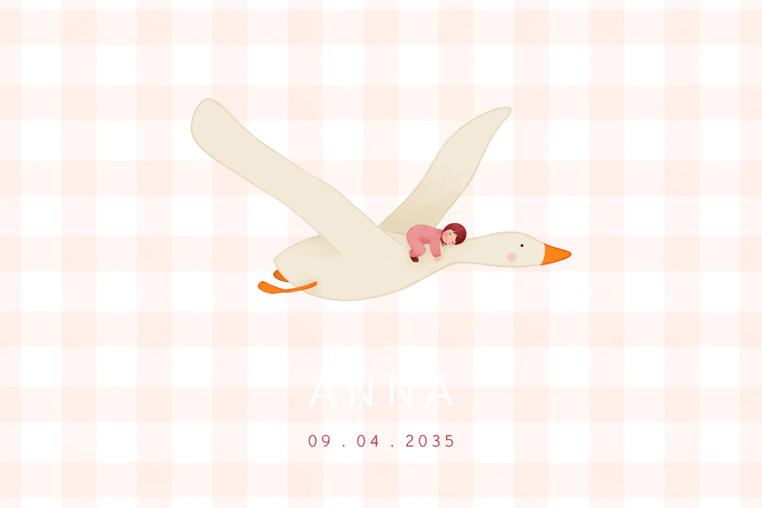 Geboortekaartje met een ruitjesachtergrond en een vliegende witte gans met een baby'tje op zijn rug.