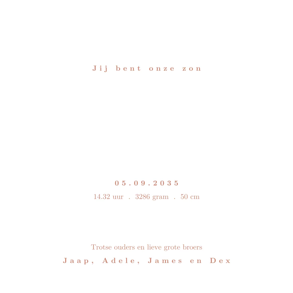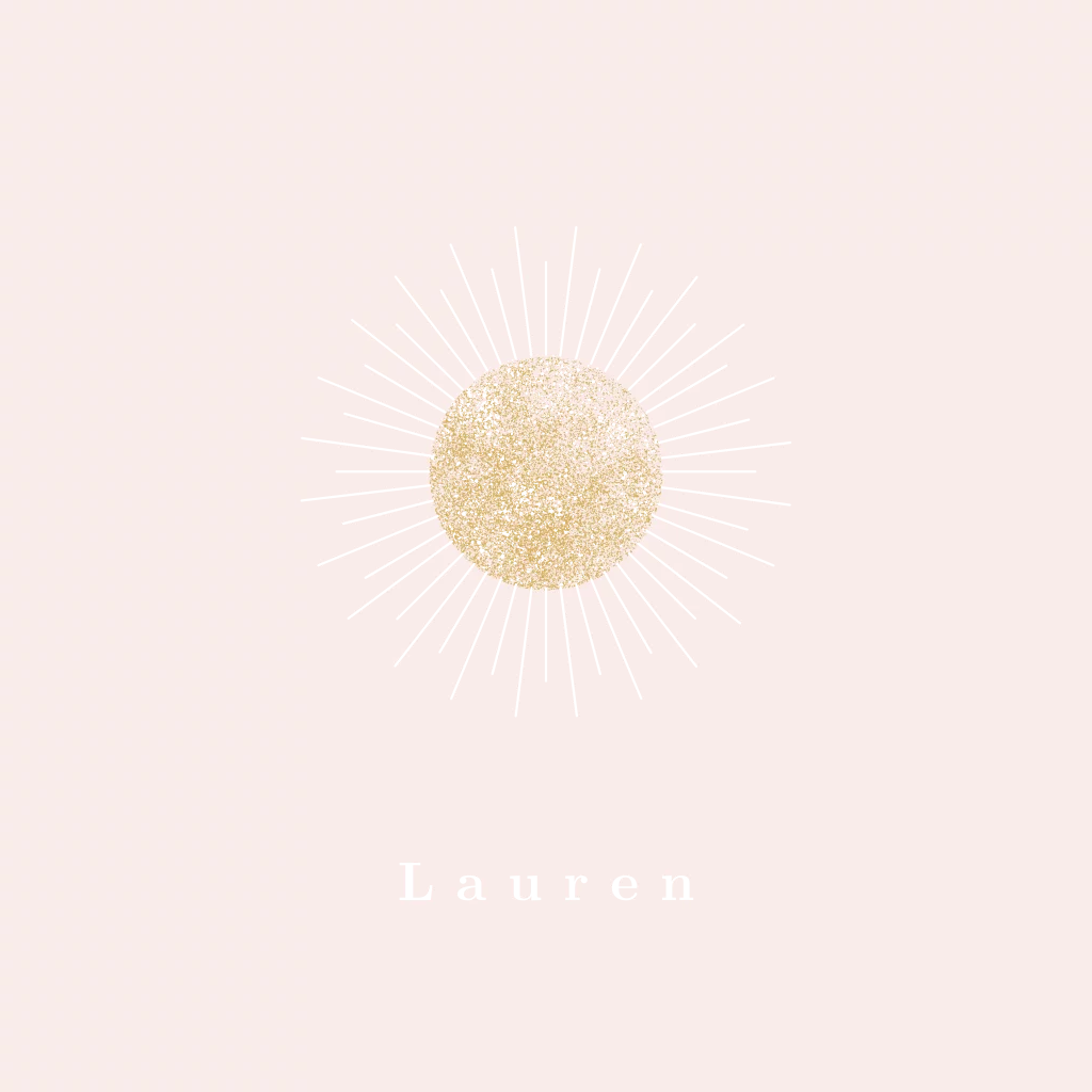 Dubbel vierkant geboortekaartje met een goudfolie zon en ook de tekst in goudfolie op een zachtroze achtergrond.