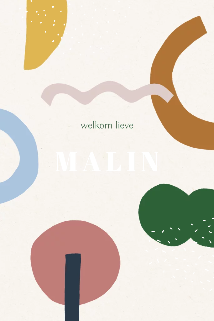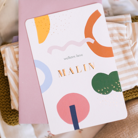 Staand geboortekaartje met abstracte vormen in fijne kleuren en goudfolie. Zijn het niet helemaal de kleuren die bij de babykamer of bij jullie passen? Dan kun je de kleuren en eventueel de positie van de vormen gemakkelijk aanpassen.