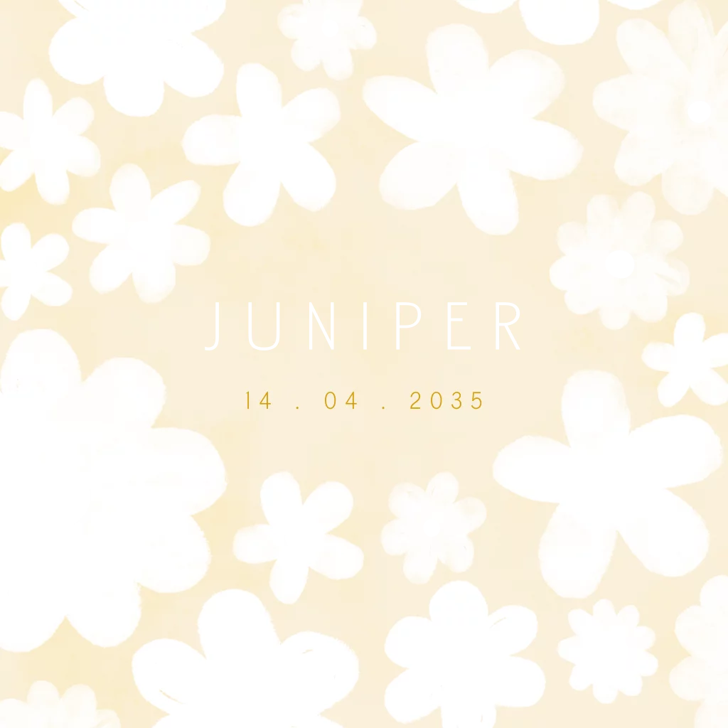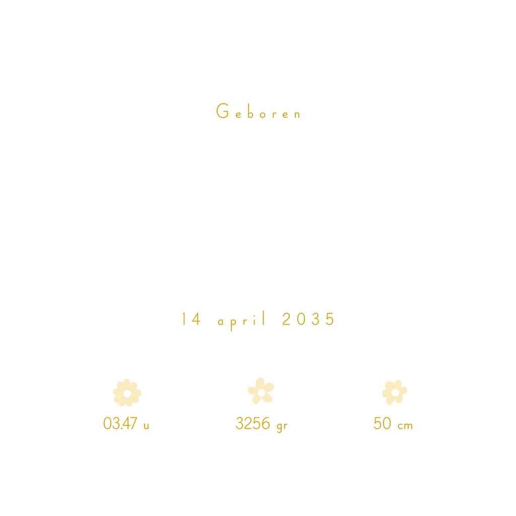 Zachtgeel vierkant geboortekaartje met grote en kleine witte bloemen met goudfolie harten. Ook de naam op de voorkant van het geboortekaartje en aan de binnenkant van het kaartje staat in goudfolie.