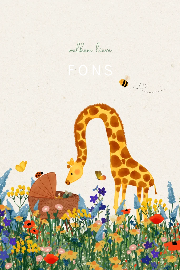 Dubbel staand geboortekaartjes met een bloemenveld, een wiegje met bruine kap en een giraf met een lange nek.