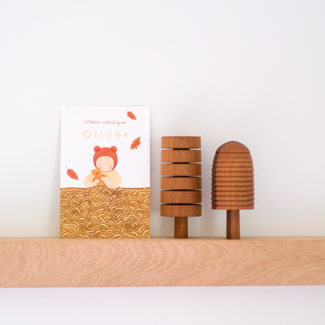 Herfst geboortekaartje met een kindje met knuffel in een bedje
