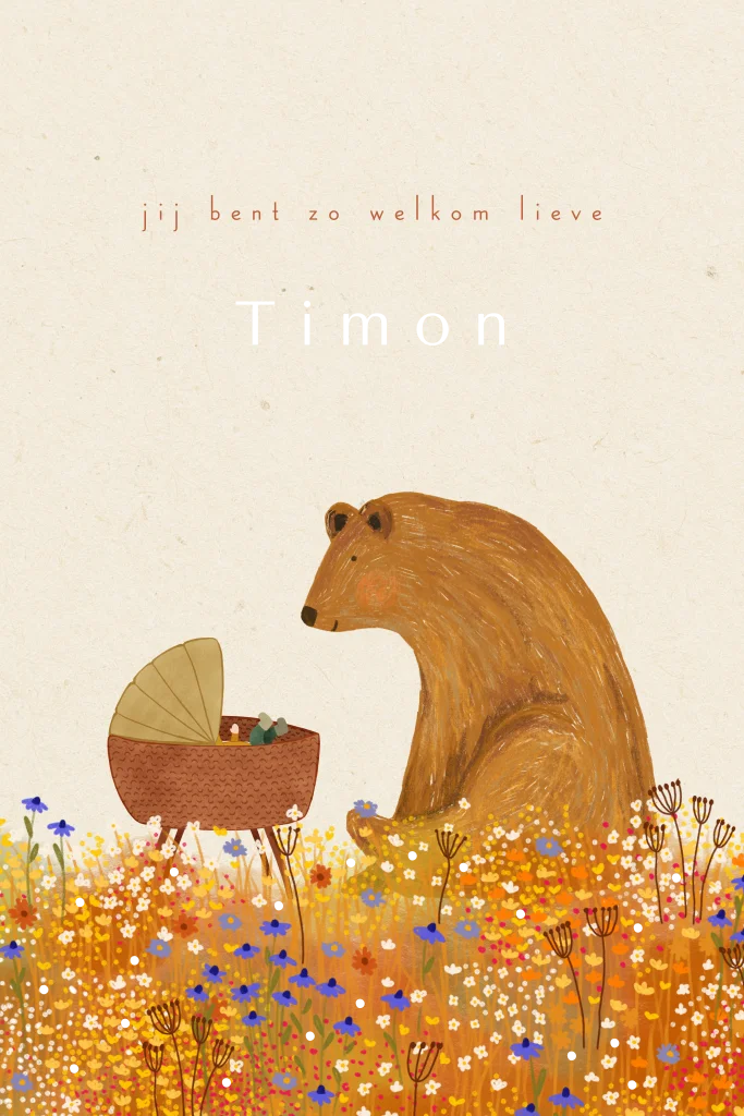 Herfstig staand geboortekaartjes met een bloemenveld, een wiegje en een grote vriendelijke beer. De naam en stipjes tussen de bloemen op de voor- en achterkant van het kaartje staan in goudfolie.
