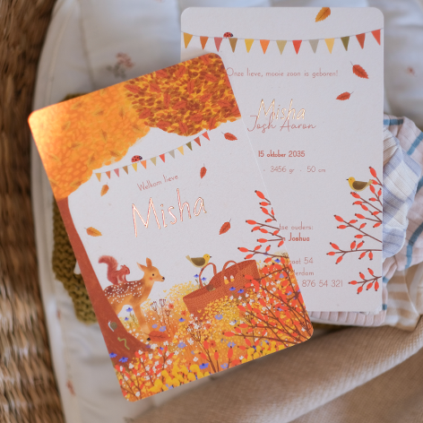 Dit enkele staande geboortekaartje is perfect voor een jongen of een meisje, met een schattig kindje in een reiswiegje, slingers, een hertje, dwarrelende blaadjes, bomen, bloemen, een eekhoorntje en de naam in goudfolie.