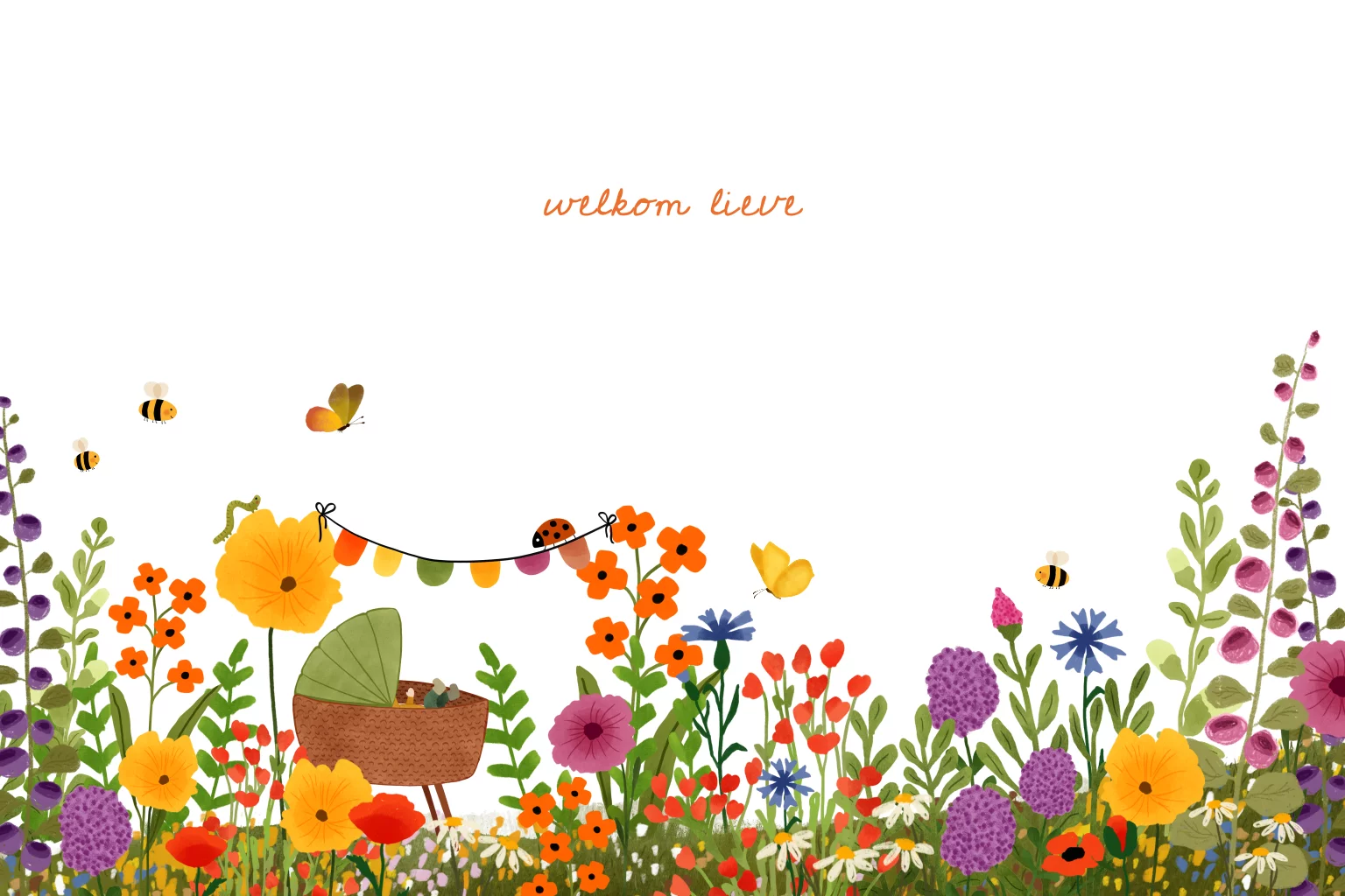 Liggend geboortekaartje met kleurrijke bloemen, een wiegje en slingers