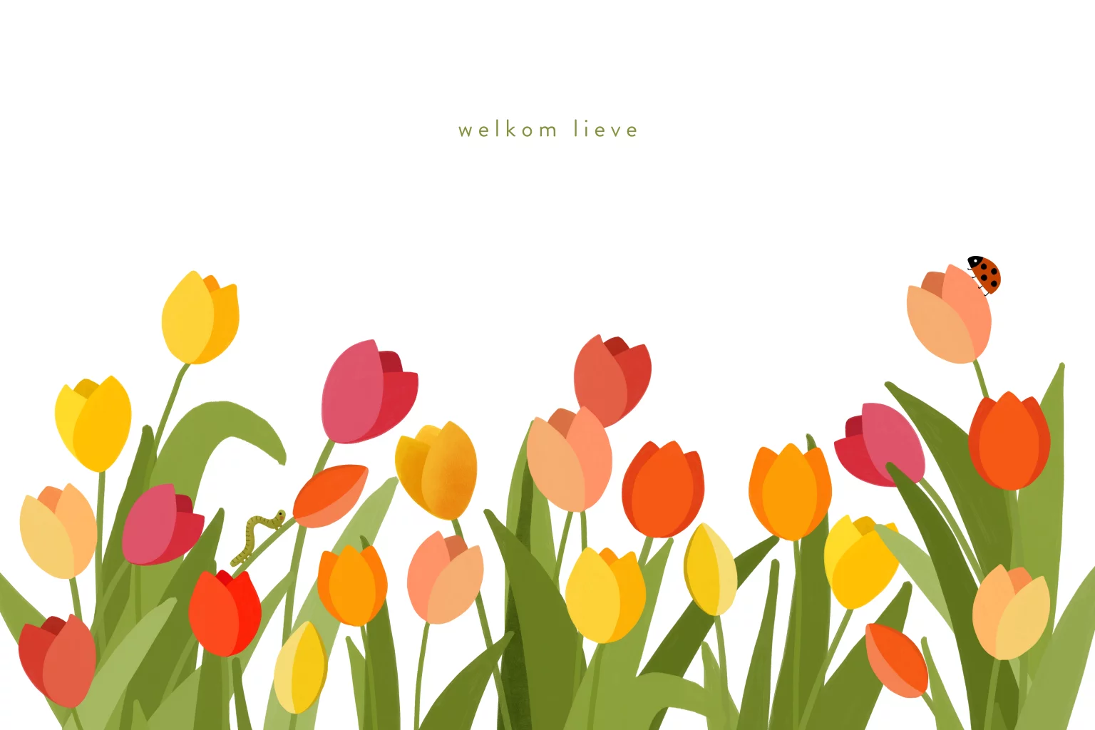 Geboortekaartje met tulpen, goudfolie, ronde hoeken, een rupsje en een lieveheersbeestje.