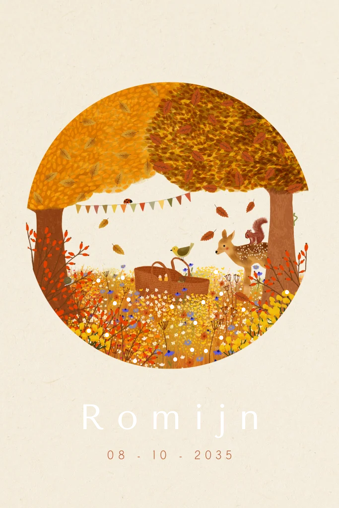 Enkel staand genderneutraal herfst geboortekaartje met een kindje in een reiswiegje, een hertje, dwarrelende blaadjes, bomen, bloemen, een eekhoorn en de naam in goudfolie.
