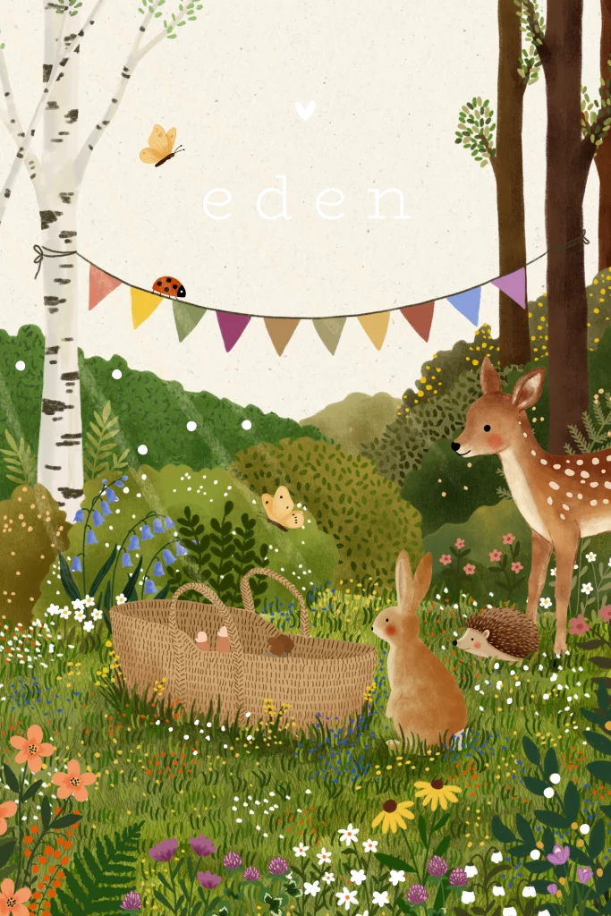 Geboortekaartje van en open plek in het bos. De zon schijnt, er fladderen vinders door de lucht, er hangen slingers en er staat een reiswiegje met daarin een lief baby'tje. De dieren komen nieuwsgierig naar het pasgeboren kindje kijken.