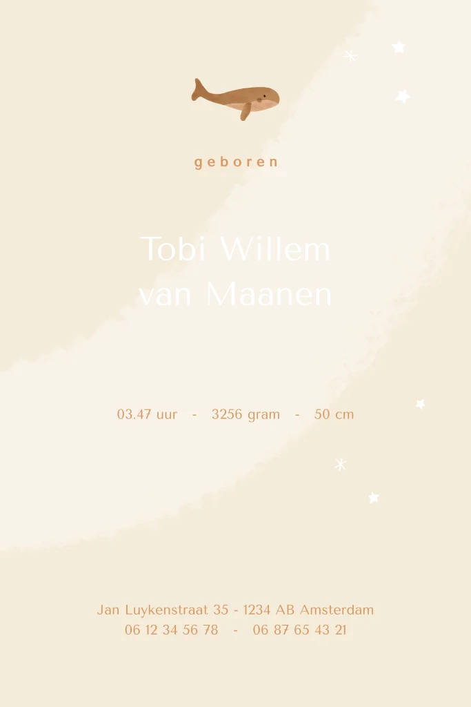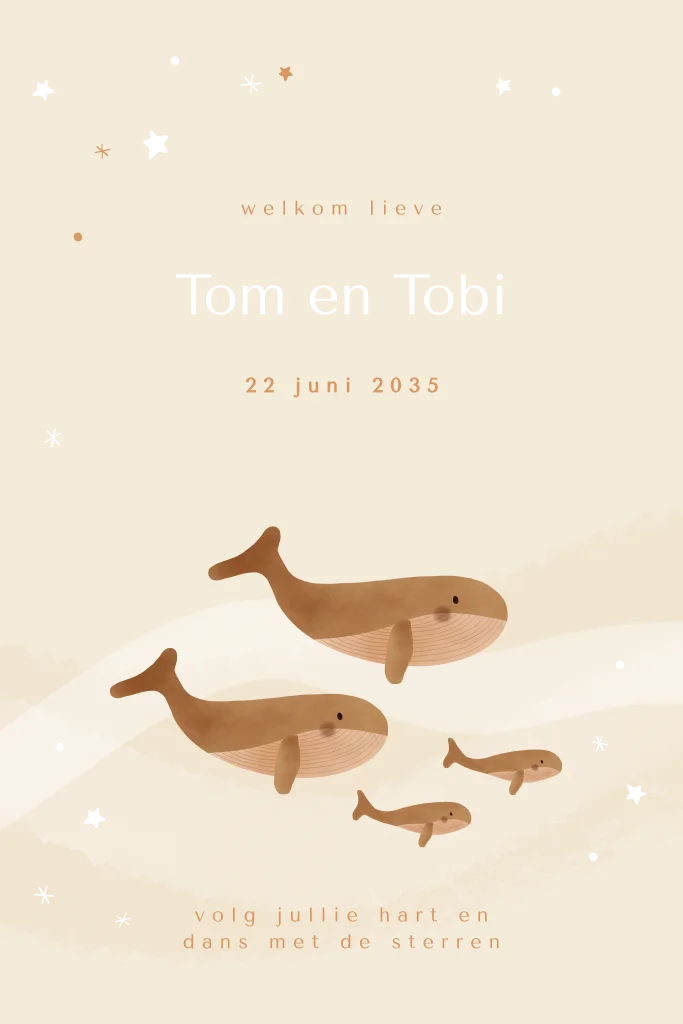Tweeling geboortekaartje met walvissen, golven, sterren en goudfolie