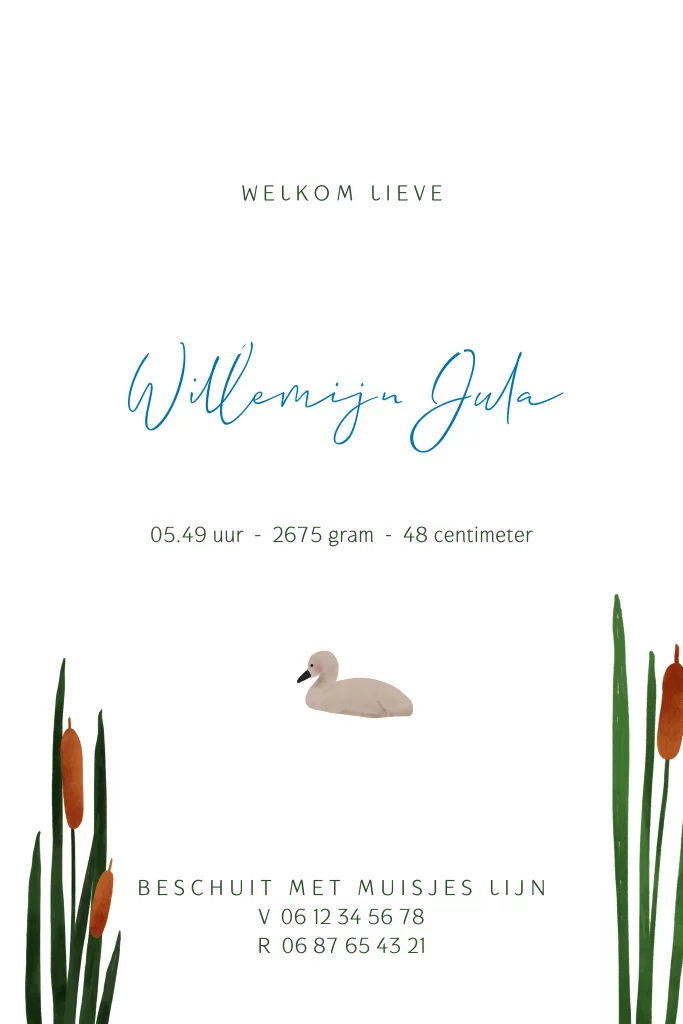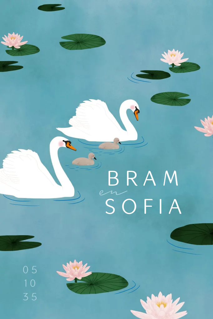 Tweeling geboortekaartje met zwanen, waterlelies en de namen in holografische folie.