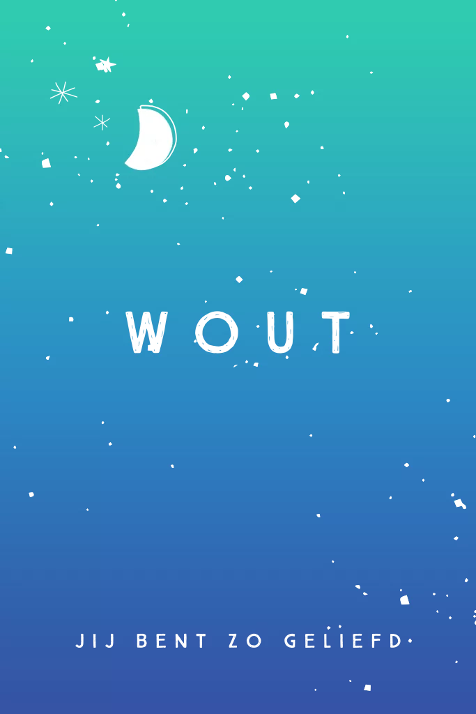 Geboortekaartje met blauwe-groene achtergrond, maan en sterren en goudfolie.