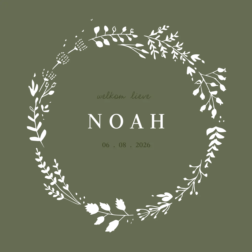 Enkel groen vierkant geboortekaartje met een goudfolie krans en ronde hoeken.