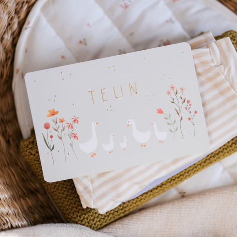 Geboortekaartje met ganzen, bloemen en goudfolie