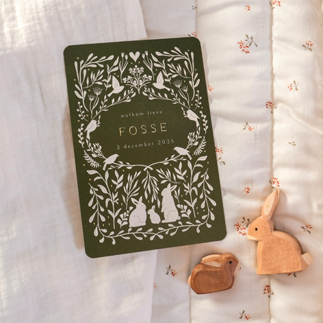 Ontdek dit betoverende geboortekaartje met een mooie donker mosgroene kleur. Dit charmante kaartje is verfraaid met glinsterende goudfolie accenten op de voorkant. De illustraties van lieflijke takjes, blaadjes, vogeltjes, een schattige familie konijn en een hartje maken dit kaartje tot een ware eyecatcher.