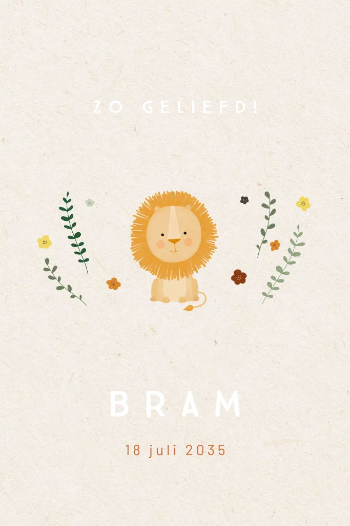Dit unieke geboortekaartje met een schattig leeuwtje, speelse takjes, en vrolijke bloemen is afgewerkt met een vleugje glinsterend goudfolie en heeft mooie ronde hoeken. De perfecte manier om de komst van jullie kleine wonder aan te kondigen.