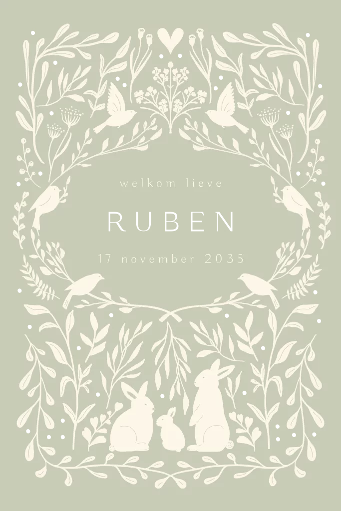 Ontdek dit betoverende geboortekaartje. Dit charmante kaartje straalt in zachte kleuren en is verfraaid met glinsterende goudfolie accenten op de voorkant. De illustraties van lieflijke takjes, blaadjes, vogeltjes, een schattige familie konijn en een hartje maken dit kaartje tot een ware eyecatcher.