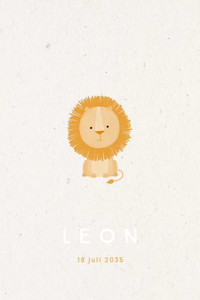 Geboortekaartje met leeuwtje, goudfolie en ronde hoeken op een karton-look achtergrond.