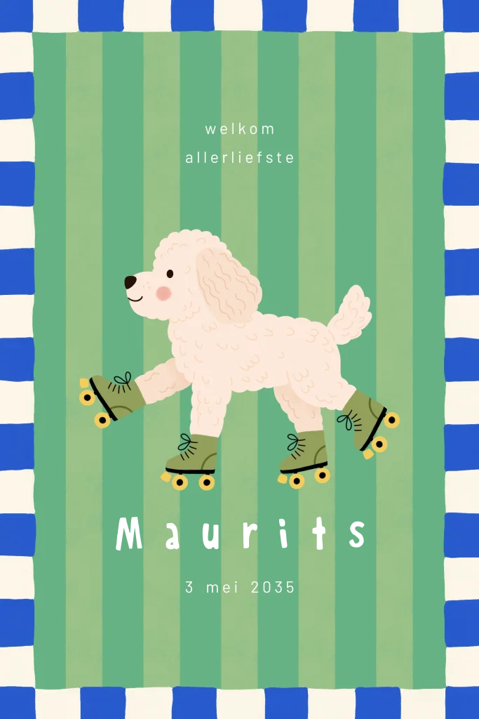 Kleurrijk geboortekaartje met een rolschaatsende witte labradoodle