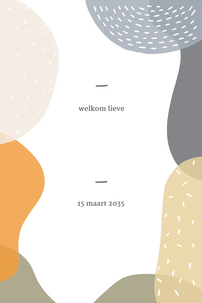 Vrolijk geboortekaartje met abstracte vormen, goudfolie en ronde hoeken.