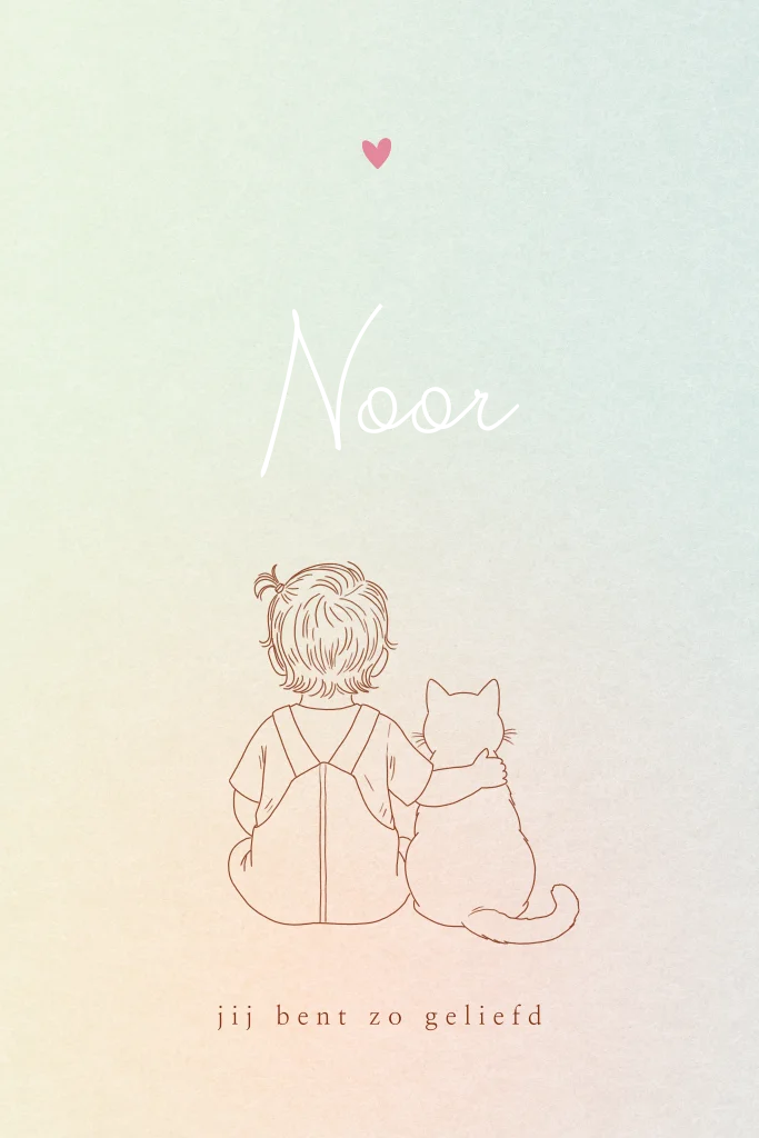 Lief geboortekaartje met een lijntekening van een meisje en een poes. De naam in goudfolie maakt het helemaal af!